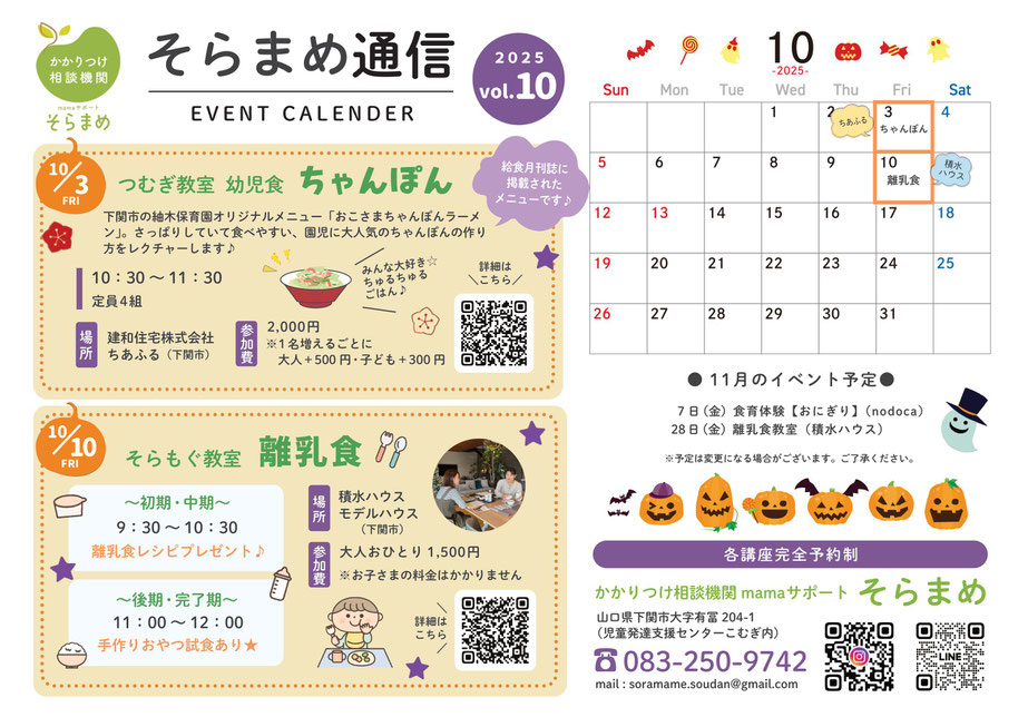 かかりつけ相談機関そらまめ11月開催の教室のお知らせです。 参加をご希望の方は、下記ご予約フォームや公式LINEにてお申し込みをお願いいたします。 みなさまのご参加お待ちしております!
