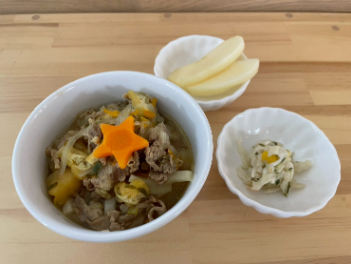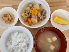 麦ごはん、だいこんと厚揚げのみそ汁、肉じゃが、はるさめの酢の物、くだもの