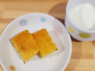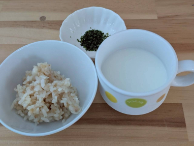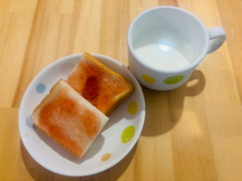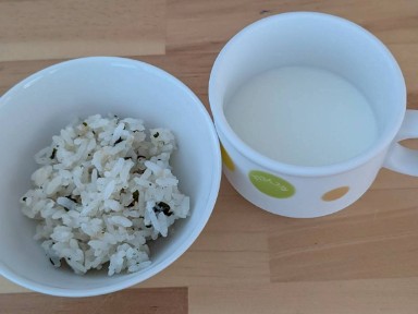 おやつ:牛乳、そぼろおにぎり(箸の練習のため、おにぎりにしていません)