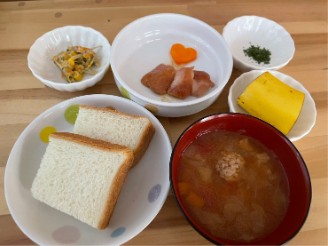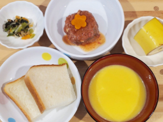 食パン、かぼちゃポタージュ、煮込みハンバーグ、小松菜のツナ酢和え(もやし)、くだもの
