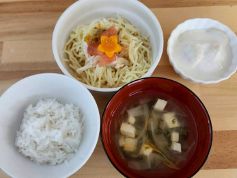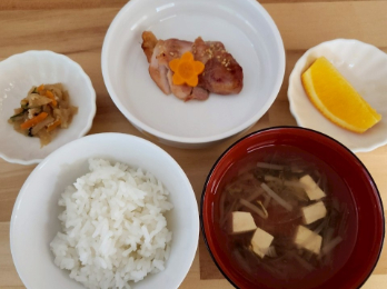 御飯、豆腐すまし汁(もやし・わかめ)、鶏肉のごまみそ焼き、切り干し大根の旨煮、くだもの