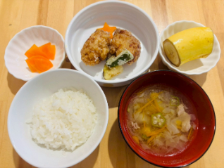 御飯、おくらの夏スープ、豆腐チキンナゲット、人参のさっぱり煮、くだもの