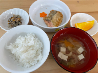 御飯、きのこのスープ、鮭の青のりフライ、梅ひじき和え(体験概念:酸味)、くだもの